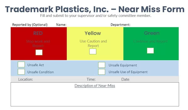 Be sure to report all near misses to your supervisor/lead, safety committee member, or HR. Near misses should be handled in the same manner as an accident and should be investigated. Corrective actions should also be taken to prevent a reoccurrence.